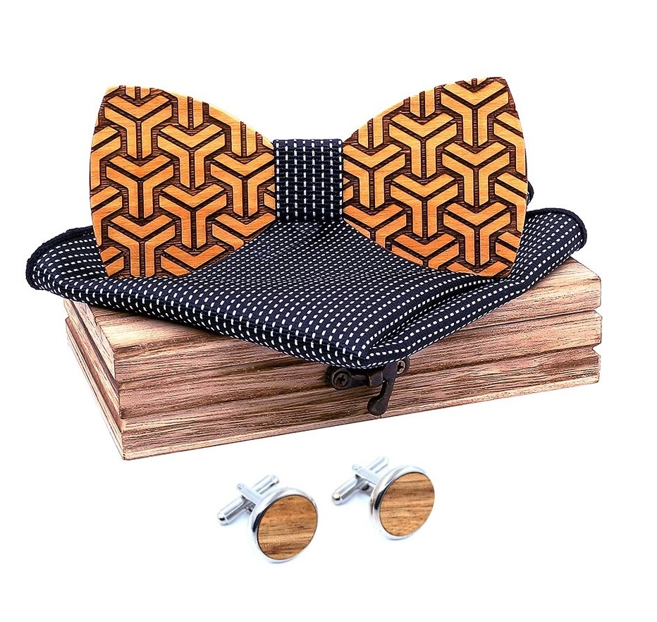 Balíček obsahuje jeden dřevěný motýlek, kapesníček, manžetové knoflíčky a krabičku.