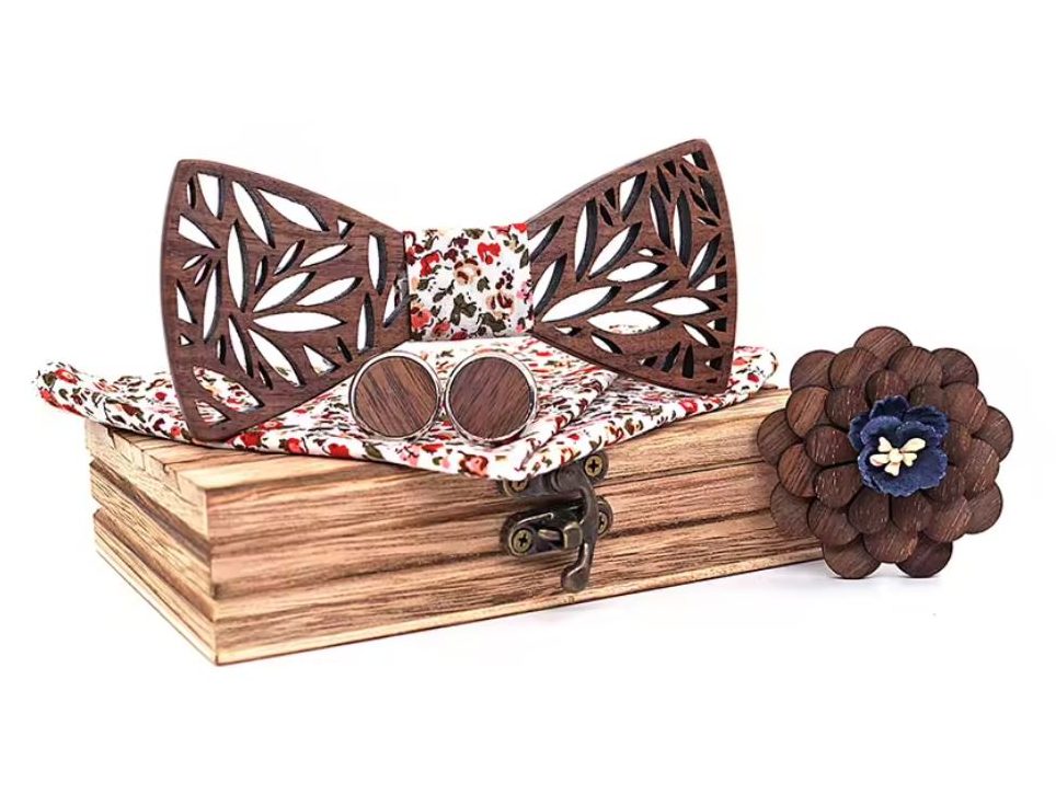 Kromě toho set zahrnuje manžetové knoflíčky a kapesníček, které navazují na květinový styl a dokreslují celkový vzhled.
